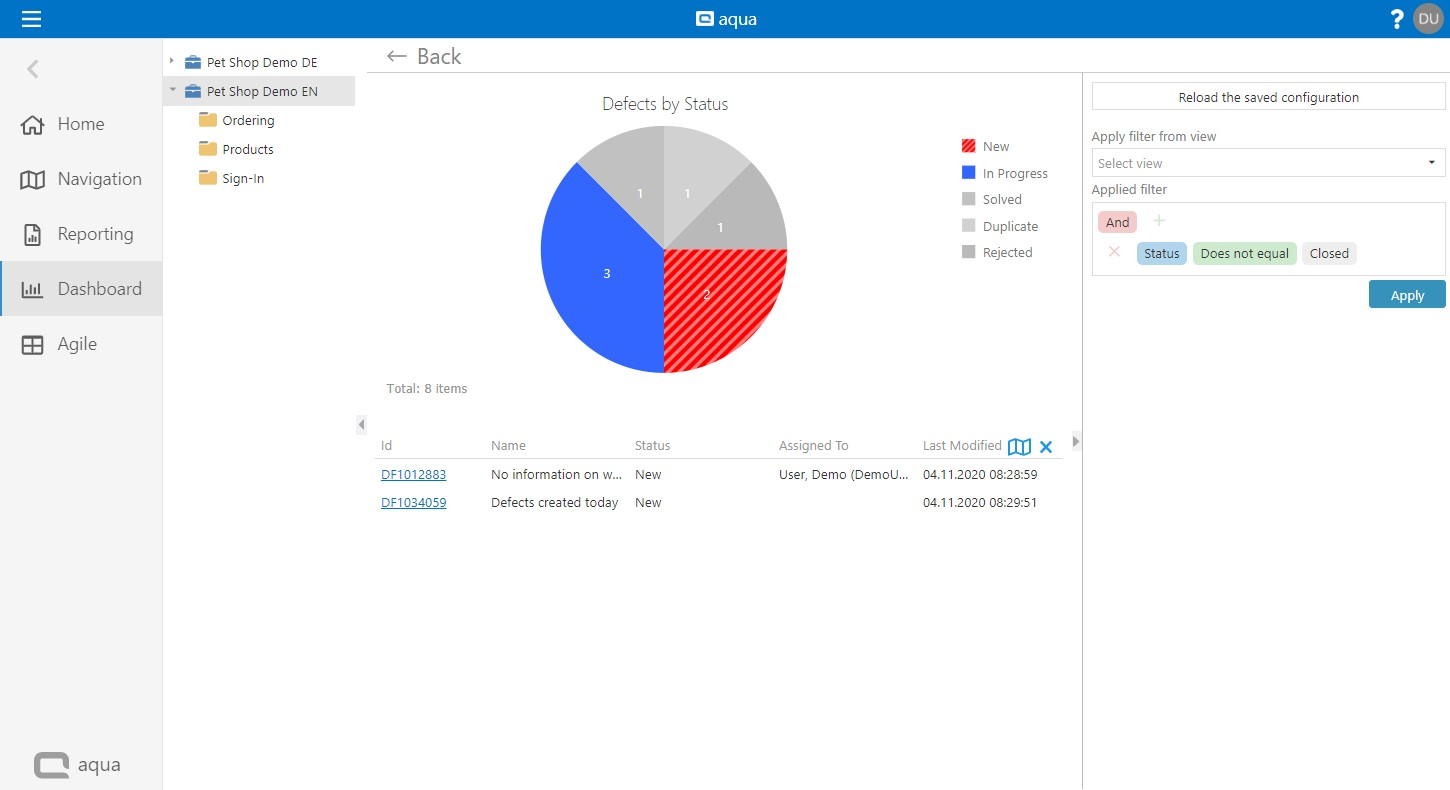 For a deeper analysis of a single chart, maximize it. You can do this either by clicking the maximize button or simply by clicking inside the widget. Now you will see your aqua project tree on the left side and a filter selection on the right side. This way you can easily apply the widget to other projects or subfolders or further narrow the widget's data using filters or views. This has no effect on the configuration of the widget itself and can be reset by clicking on Reload the saved configuration or when returning to the dashboard.