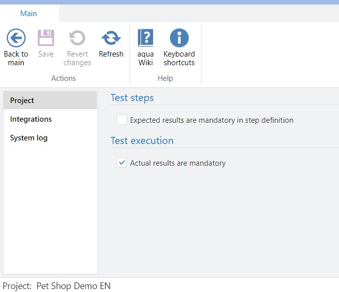 You can define the expected result and actual results of test cases as mandatory. To do so select your project in the project browser and click on the configuration menu in the upper left corner of the aqua header . In the project configuration area select the entry Settings.