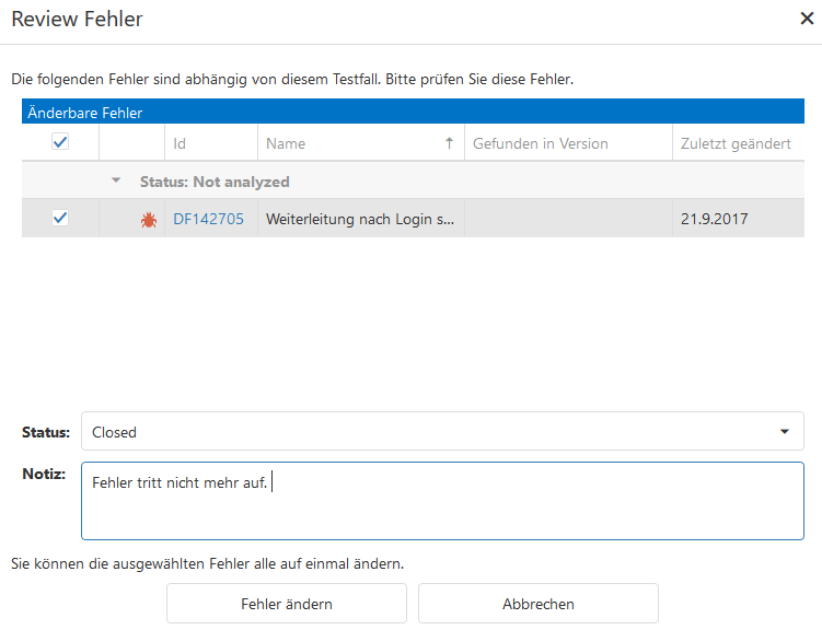 Ein Fenster öffnet sich, indem alle abhängigen Fehler angezeigt werden. Hier können Sie deren Status ändern und eine Notiz hinzufügen. Sie können alle abhängigen Fehler auf einmal aktualisieren.