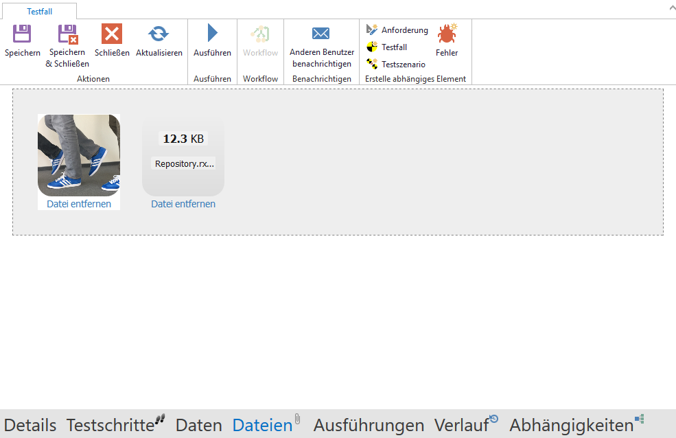 Sie können Anhänge zu Elementen oder Ausführungen in aqua Web hinzufügen. Dafür öffnen Sie ein Element und klicken auf Dateien in der unteren Leiste. Hier können Sie einfach Ihre Dateien hineinziehen oder in den grauen Bereich klicken, um nach einer Datei zu suchen.