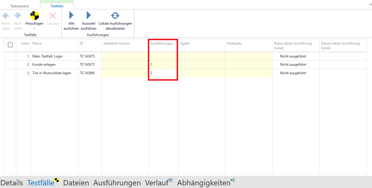 Sie können innerhalb eines Testszenarios eine Abhängigkeit zwischen Testfällen setzen. Das bedeutet, dass wenn ein bestimmter automatisierter Testfall fehlschlägt, keiner der anderen Testfälle ausgeführt wird, die von diesem Testfall abhängen. Tragen Sie dazu einfach Werte in die Spalte 'Ausführungsabhängigkeit' ein. Im Beispiel hängt Testfall 2 von Testfall 1 ab und Testfall 3 von Testfall 2. Schlägt also Testfall 1 fehl, so werden Testfall 2 und 3 nicht ausgeführt.