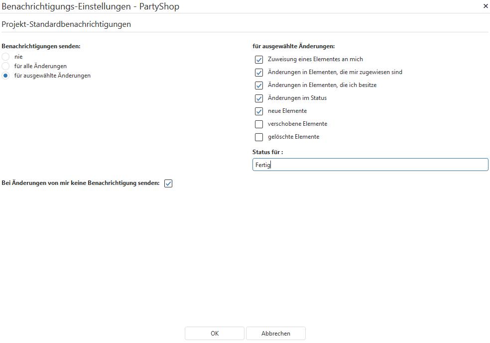 Wenn Sie 'Änderungen im Status' auswählen, können Sie einen Status definieren. Sie erhalten dann nur in diesem spezifischen Status Benachrichtigungen. Wenn Sie mehrere Status-werte angeben möchten, so können Sie diese mit einem Semikolon trennen. Wenn Sie das Feld frei lassen, werden für alle Änderungen am Status-Wert E-Mails versendet.