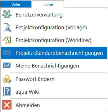 Wählen Sie ein Projekt aus und klicken auf Datei, um Projekt Standardbenachrichtigungen für alle Benutzer zu definieren oder definieren Sie Meine Benachrichtigungen, um die Projekt-Standard-Einstellungen zu überschreiben.