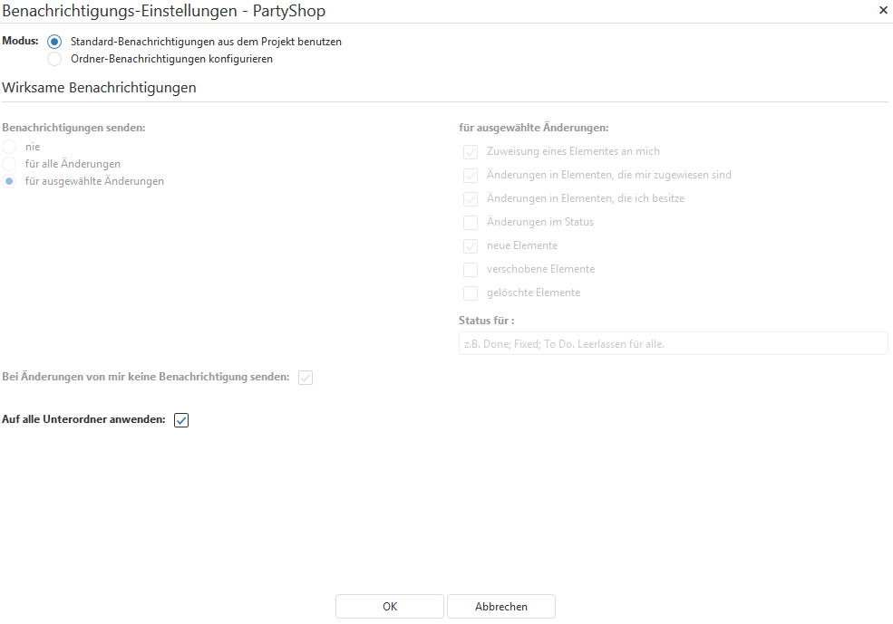 Meine Benachrichtigungen erlaubt es Ihnen, Benachrichtigungen für Ordner zu setzen. Wählen Sie einfach den entsprechenden Ordner im Projektbaum aus und öffnen Meine Benachrichtigungen. Diese können auch über einen Rechtsklick auf den gewünschten Ordner geöffnet werden.