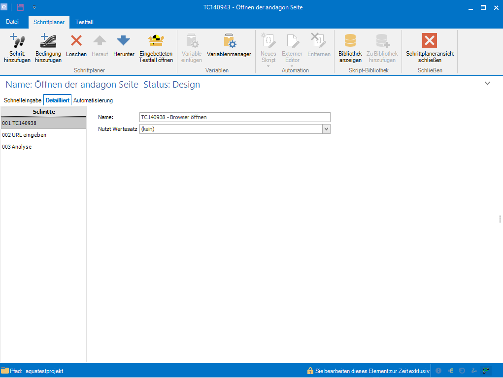 Speichern Sie den Testfall und erstellen einen neuen mit dem Namen Öffnen der andagon Seite. Dieser hat zwei weitere Testschritte.
