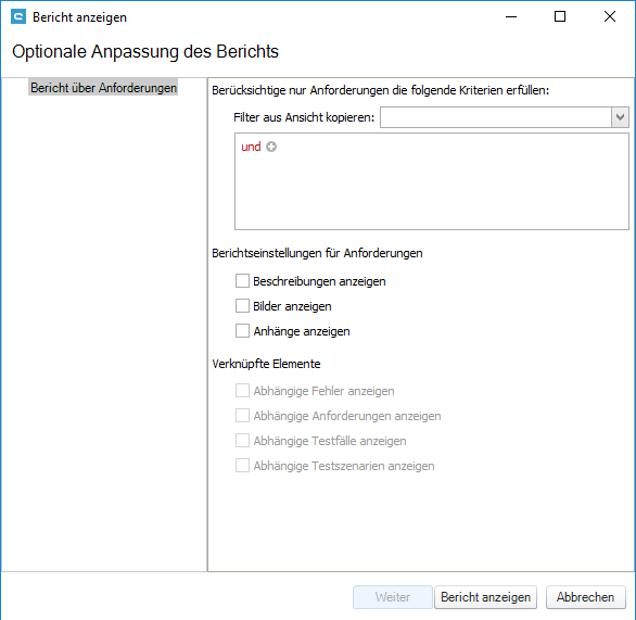 Vor der Erstellung eines Berichts wird ein Dialog angezeigt, in welchem die Basis des Berichts unter Verwendung von Filtern eingestellt werden kann. In diesem Dialog können Sie auch auswählen, ob Sie z.B. Bilder einbeziehen wollen. Diese Einstellungen werden vor Erstellung des Berichts gesetzt. Wenn Sie die Berichtvorlage erstellen, können jedoch später im Einstellungen editieren-Kontext geändert werden.