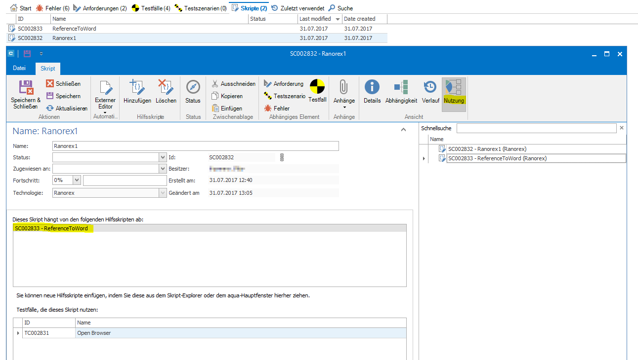 Um solche Verweise zu vereinfachen, können Sie die sogenannten Utility-Skripte benutzen. Dies sind zusätzliche Skriptelemente, die zu Skripts hinzugefügt werden können. Dafür klicken Sie auf den Button Nutzung. Alternativ können Sie das Referenzskript im ersten Testschritt platzieren.