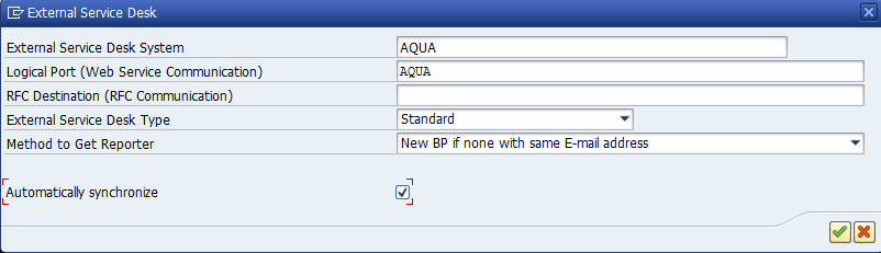 4. Klicken Sie auf Fortsetzen (Beachten Sie, dass der SAP Solution Manager nun versucht, sich mit dem Webservice von aqua zu verbinden. Wenn dies schiefgeht, wird im unteren Bereich des Fensters ein Fehler angezeigt und der externe Service wird nicht erstellt)