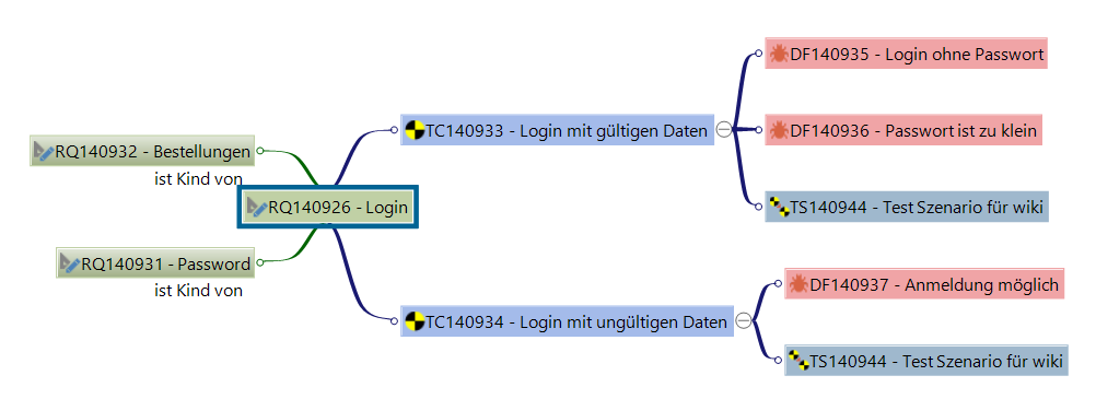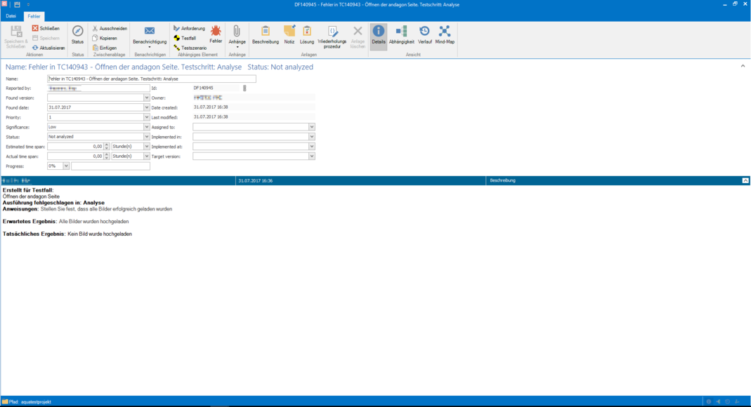 Der Name wird automatisch definiert, durch Nutzung der Testfall ID, des Testfallnamens und des Testfall-Schritts. "Gefunden von" und "Gefunden in" wird vom Testfall abgeleitet. In der Beschreibung wird der Fehler durch die Informationen im Testschritt definiert. Nach dem Speichern des Testfalls, können Sie in den Abhängigkeiten analysieren, wie Sie den Fehler reproduzieren können und welche Testfälle ausgeführt werden müssen, um anzugeben, dass die Funktionalität gelöst ist.
