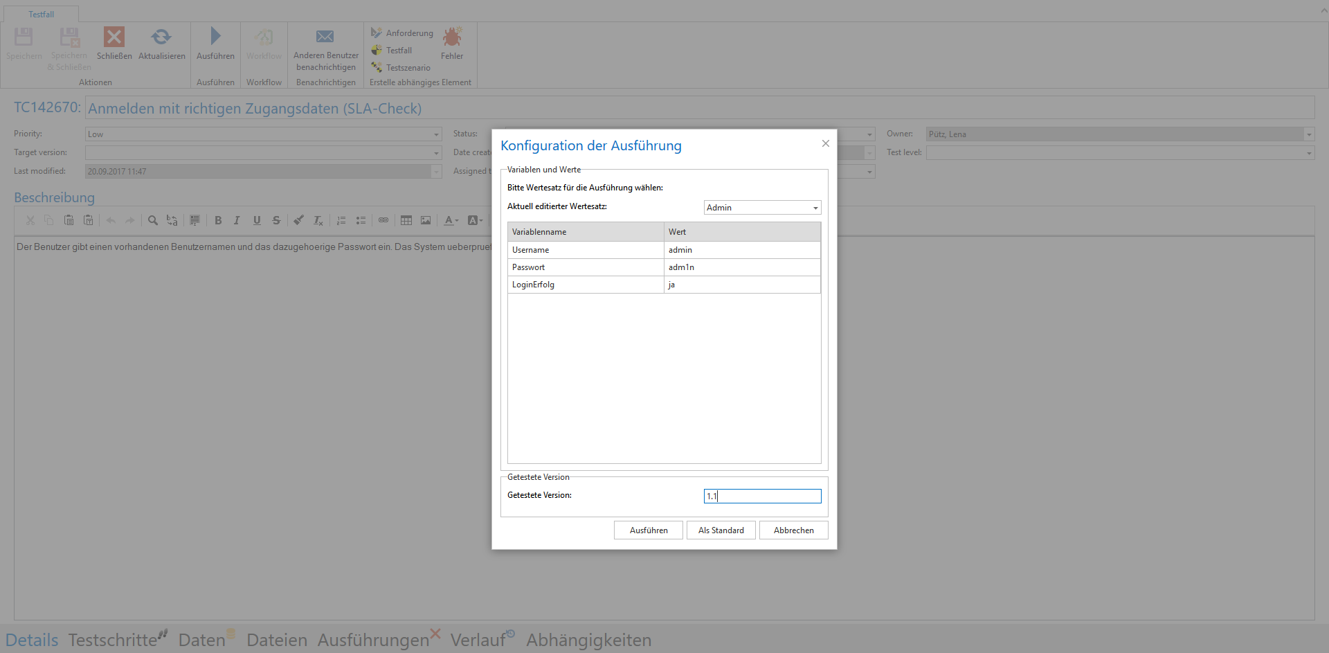 Wenn ein Test mit Testschritten und Testbedingungen angelegt wurde, haben Sie die Möglichkeit den Testfall manuell auszuführen. Öffnen Sie einen Testfall und klicken Sie auf Ausführen.