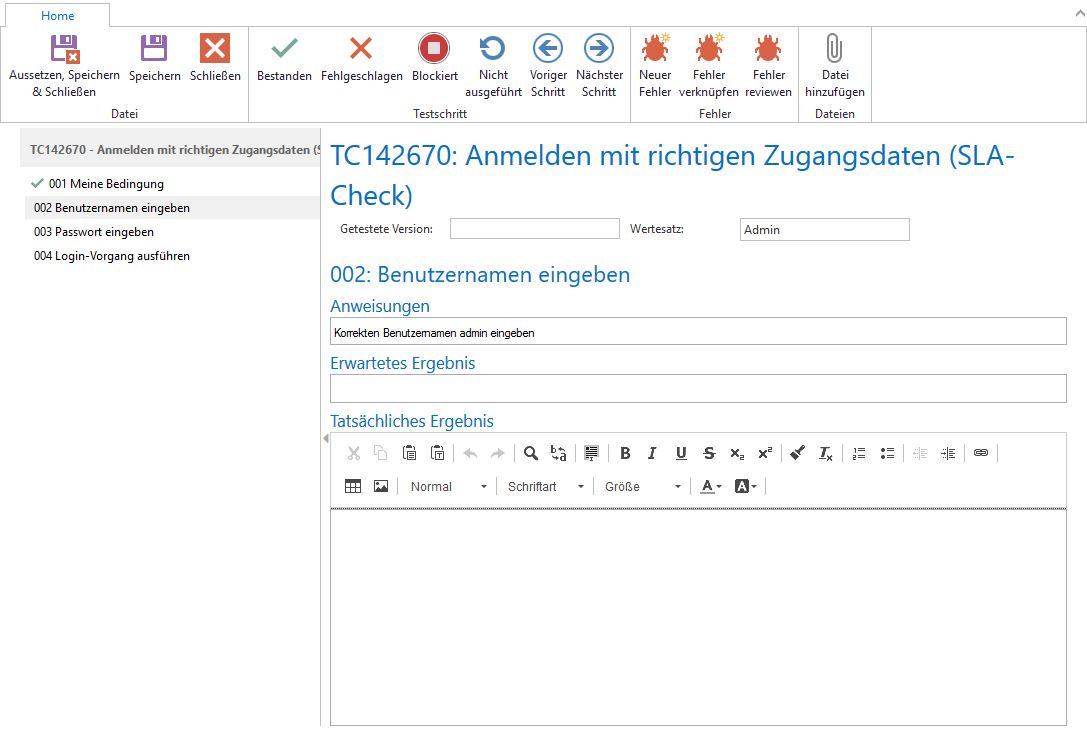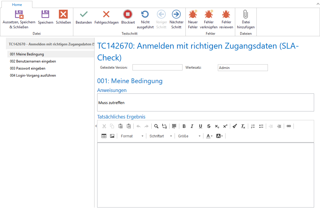Ein neuer Tab zeigt Schritt für Schritt die Aufgaben an, die im Testfall durchgeführt werden müssen. Der folgende Screenshot zeigt einen Bedingungsschritt. Dokumentieren Sie das aktuelle Verhalten in Tatsächliches Ergebnis.