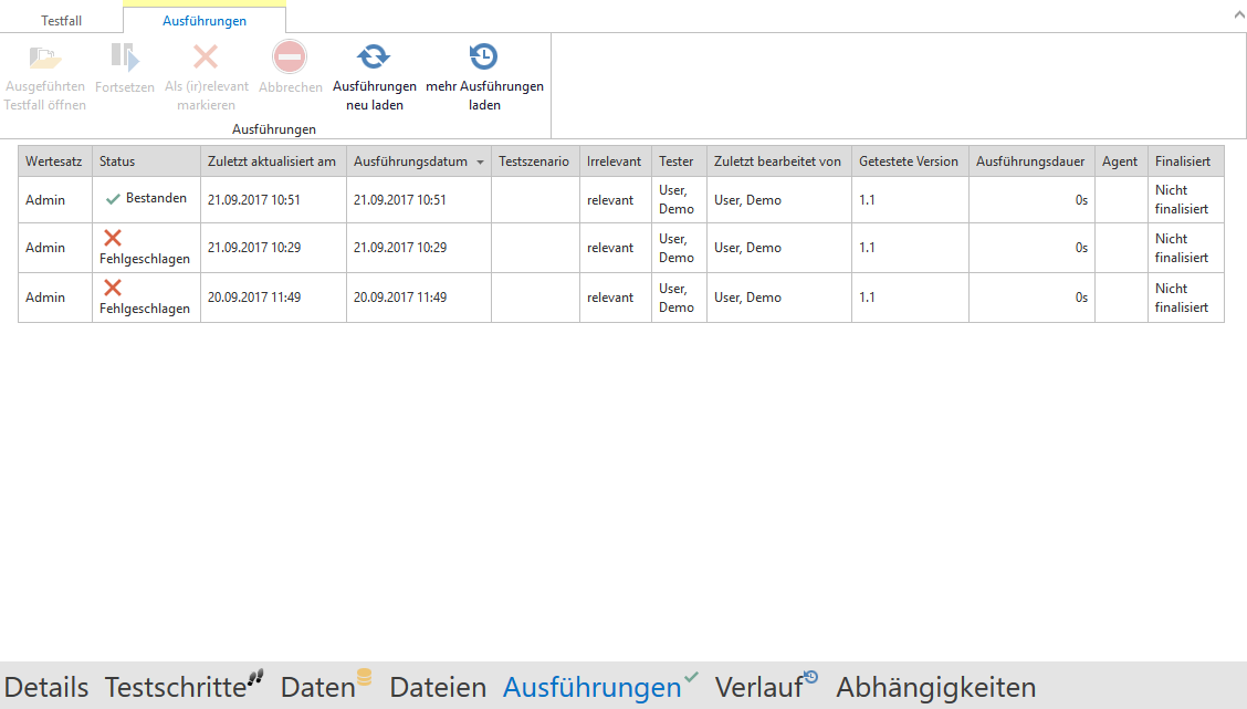 Klicken Sie auf den Button Fortsetzen unter Ausführungen und führen Sie so die Ausführung des Testfalls fort, wenn dieser nicht finalisiert wurde. Testergebnisse können erneut spezifiziert werden. Außerdem kann eine Ausführung dort als Irrelevant markiert werden.