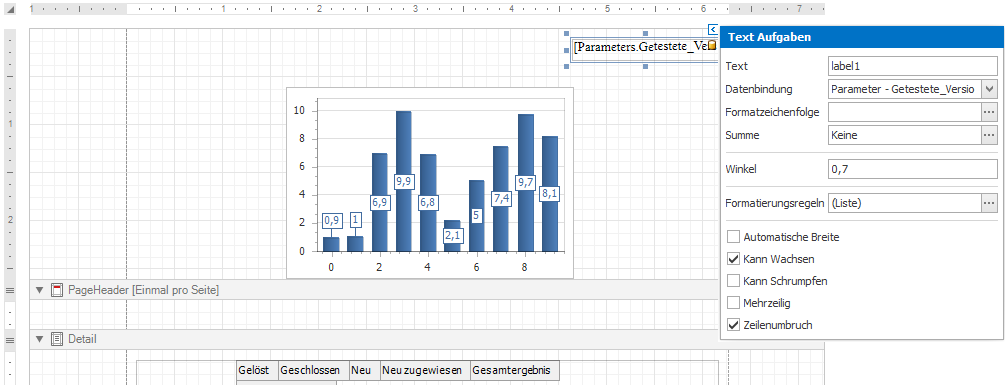 In aqua können Sie Parameter eingeben, um Ihre Berichte zu spezialisieren und zu filtern. Dafür öffnen Sie den Bericht-Designer. Auf der rechten Seite können Sie einen neuen Parameter eingeben, welcher benutzt werden kann, um Elemente zu spezifizieren und zu filtern. Im Folgenden erklären wir, wie Sie die Getestete Version einer Testausführung in einem Testszenario filtern.