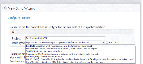 Das Tool kennt einen speziellen JIRA Issue-Typ namens Unteraufgabe. Die Erstellung einer Unteraufgabe wird nach der Erstellung einer existierenden Aufgabe in JIRA durchgeführt. Der Sync-Assistent hat eine andere Konfiguration für diesen Issue-Typ.