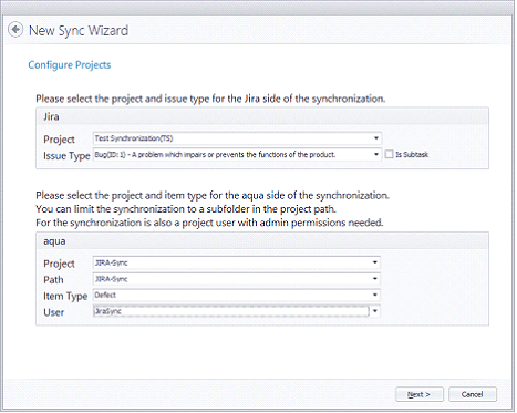 Nun definieren wir, welche JIRA-Projekte für die Synchronisation mit dem aqua Projekt verwendet werden sollen. Dazu wählen Sie das entsprechende Projekt und verfügbare Issue-Typen aus. JIRA Bugs können nur aqua Fehlern zugeordnet werden. Alle anderen Typen können aqua Anforderungen zugeordnet werden.