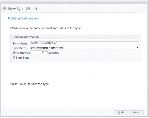 Wir sind jetzt beim letzten Schritt des Assistenten angekommen. Die Konfiguration, die wir erstellen braucht einen Namen, um sie von anderen Konfigurationen zu unterscheiden. Der vordefinierte Sync Name wird wie folgt aufgebaut: "JIRA(Projektschlüssel)< - >aqua(aqua-Projekt)". Dieser Name kann geändert werden. Dieses Feld darf nicht leer bleiben oder mehr als 255 Zeichen beinhalten. Diese Namen dürfen nicht die gleichen wie von existierenden Syncs sein.