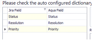 Es gibt hier drei Hauptbereiche. Der linke Bereich zeigt, welche der vordefinierten, zugeordneten Felder zwischen aqua und JIRA im letztem Schritt angepasst wurden. Der Unterschied ist, dass diese Felder spezifische Wertezuordnungen benötigen. Deshalb werden Sie hier angezeigt. Für unser Beispiel haben wir mehrere Werte für "Status", "Lösung" und "Priorität":