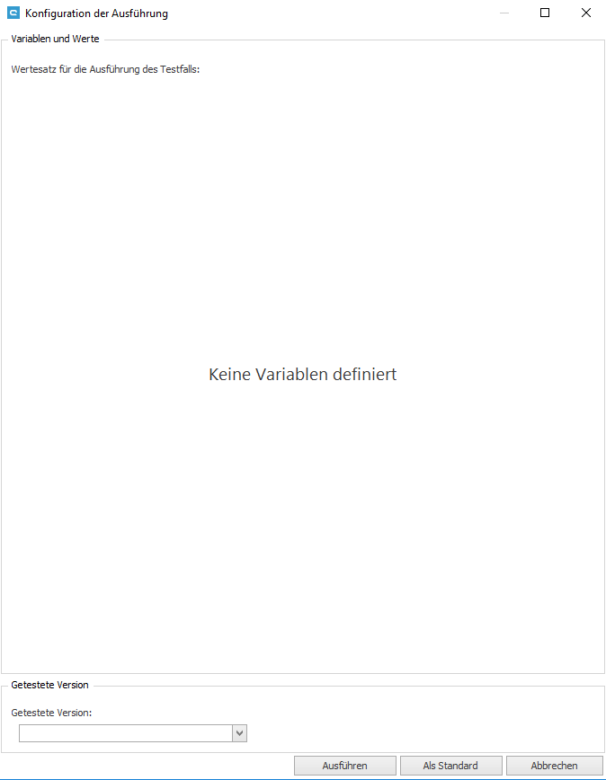 Ein neues Fenster öffnet sich, in dem Sie die getestete Version eingeben und einen Wertesatz auswählen können. Der Wertesatz ist im Variablen Manager beschrieben. Nachdem Sie die getestete Version eingegeben haben, klicken Sie auf Ausführen.