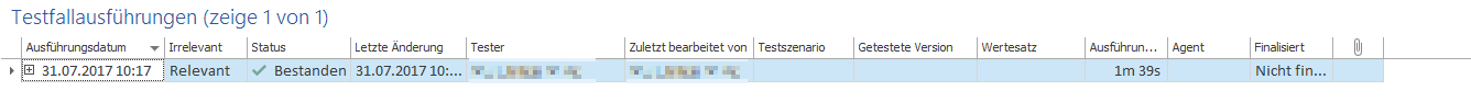 Klicken Sie auf den Button Ausführung fortsetzen unter Ausführung und führen Sie so die Ausführung des Testfalls fort. Testergebnisse können erneut spezifiziert werden. Außerdem kann eine Ausführung dort als Irrelevant markiert werden, wenn eine Testausführung fehlerhaft war.