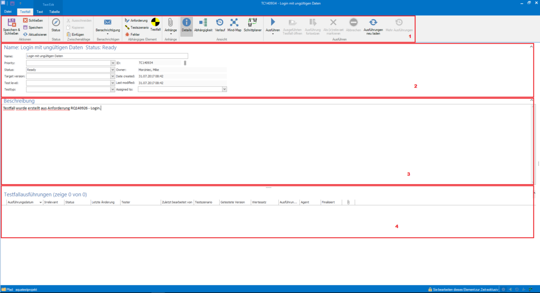 In diesem aqua Modul haben Sie die Möglichkeit, Testfälle zu organisieren und zu spezifizieren. Wenn Anforderungen erstellt wurden, ist es möglich Testfälle und Testszenarien automatisch von diesen abzuleiten. Alternativ können Sie Testfälle und Testszenarien auch manuell erstellen. Innerhalb eines Testfalls müssen Sie Testschritte und Testbedingungen definieren, z.B. Index, Testschritttyp, Name, Anweisungen und Erwartetes Ergebnis. Ein Testfall muss immer auf mindestens einem Testschritt oder einer Testbedingung bestehen. Ein Testszenario besteht aus zwei oder mehr Testfällen, die entweder logisch oder funktional verbunden sind. Testfälle, die von einer Anforderung abgeleitet wurden, werden automatisch mit der zugehörigen Anforderung verbunden. Manuell erstellte Testfälle können mit jeder Anforderung oder Element (z.B. Fehler) verbunden werden. Diese Abhängigkeit zu erstellen gibt Ihnen eine direkte Übersicht über alle verbundenen Elemente und unterstützt die einfache Navigation zwischen ihnen.