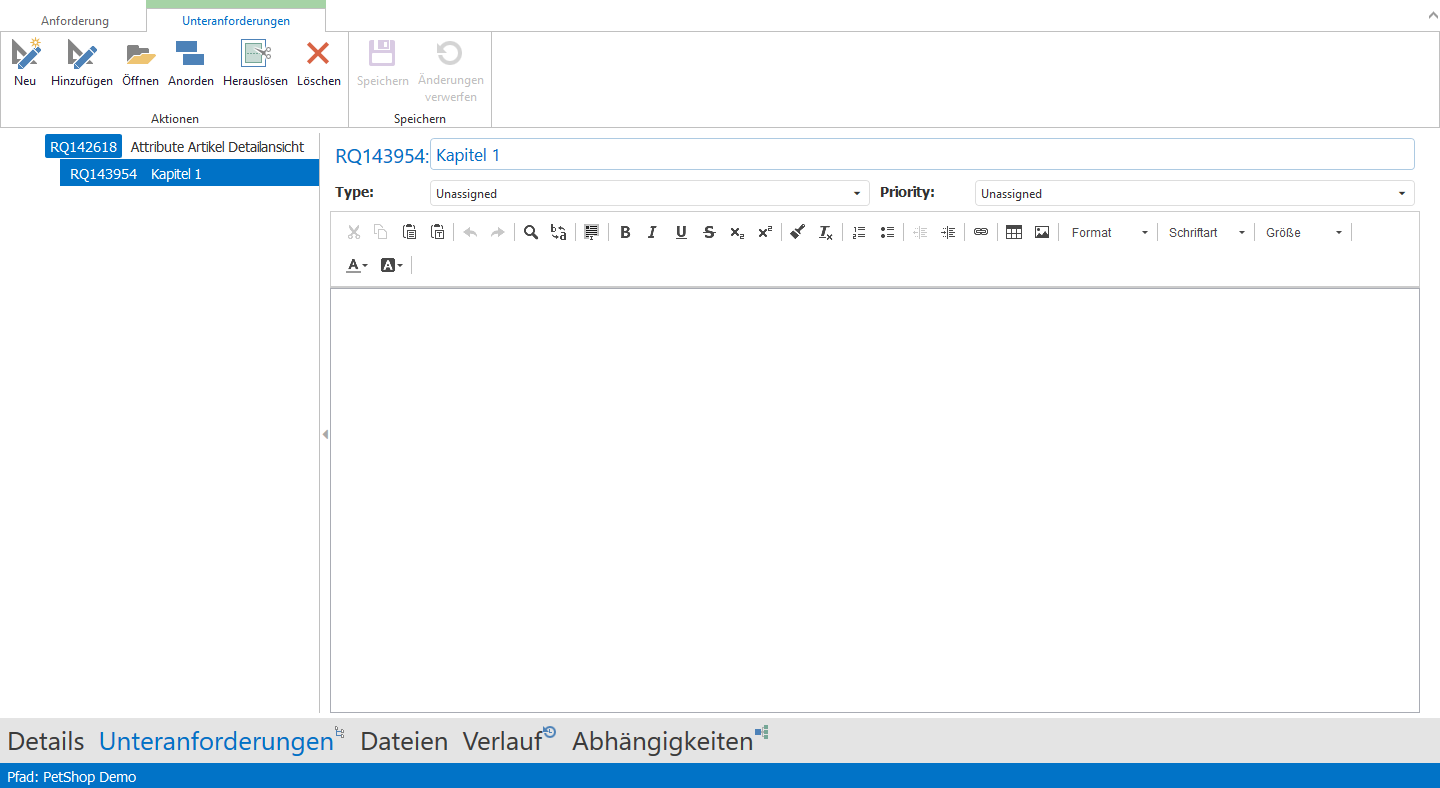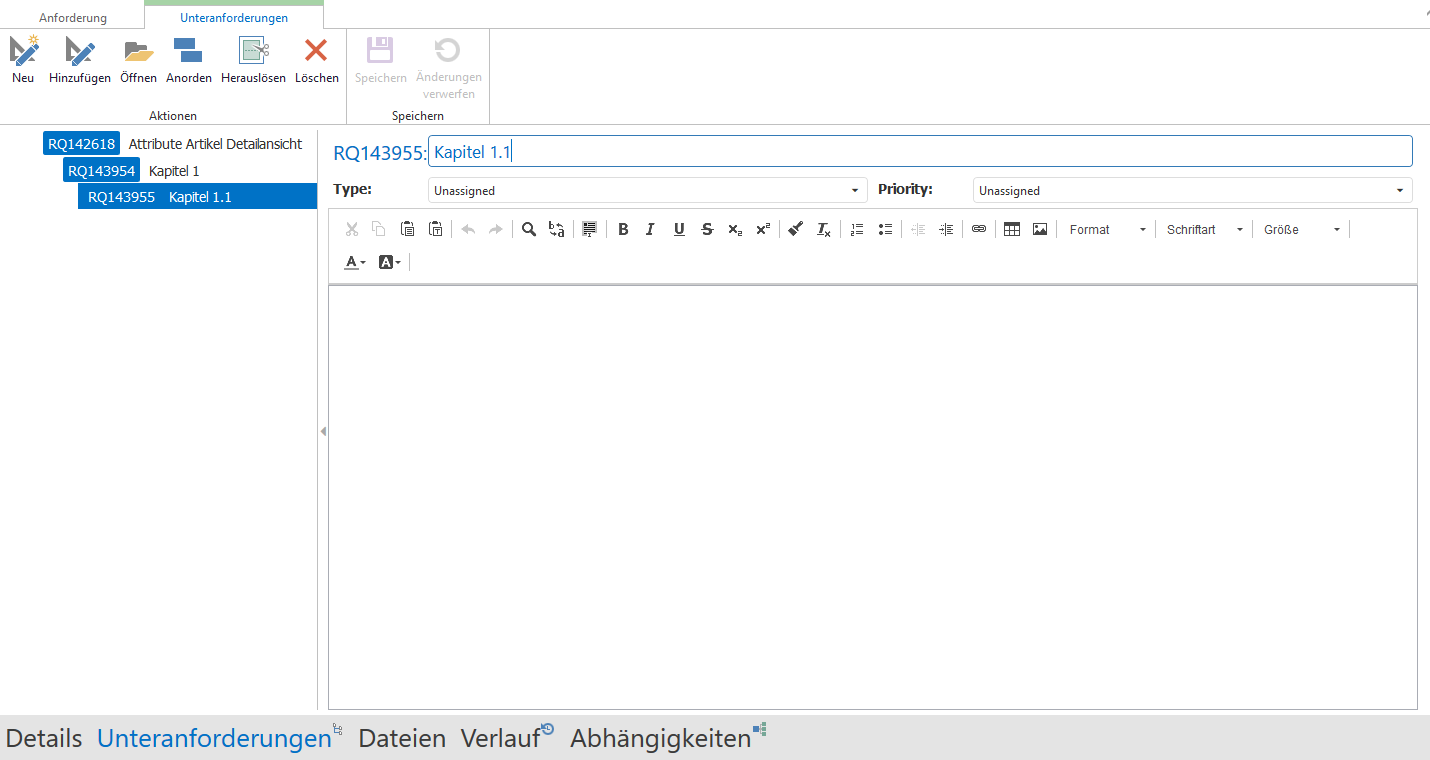 Hier können Sie neue Kapitel erstellen. Klicken Sie auf um eine neue Unteranforderung zu erstellen. Wir können dies in Kapitel 1 spezifizieren.