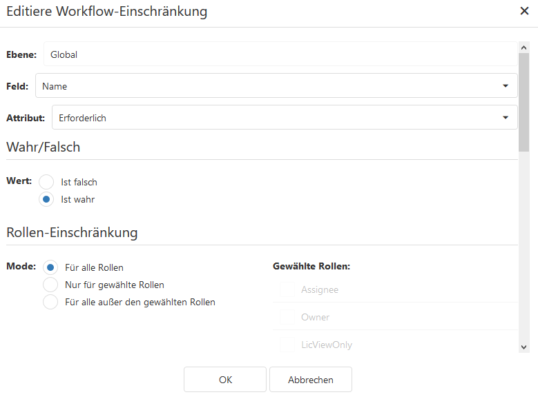 Klicken Sie in die Feld-Auswahlliste und wählen Sie Name von der Liste der existierenden Felder. Um das Feld Name verpflichtend zu machen, klicken Sie in die Auswahlliste Attribute und wählen Erforderlich. Wählen Sie die Checkbox Ist wahr und die Bedingung Für alle Rollen.