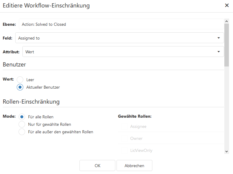 Klicken Sie in die Auswahlliste Feld und wählen Assigned to von der Liste der existierenden Felder aus. Um den Wert des Feldes zu setzen, klicken Sie auf die Auswahlliste Attribute und wählen Wert aus. In diesem Fall wollen wir den Benutzer setzen, der den Wert des Status ändert, also klicken Sie auf den Wert Aktueller Benutzer.