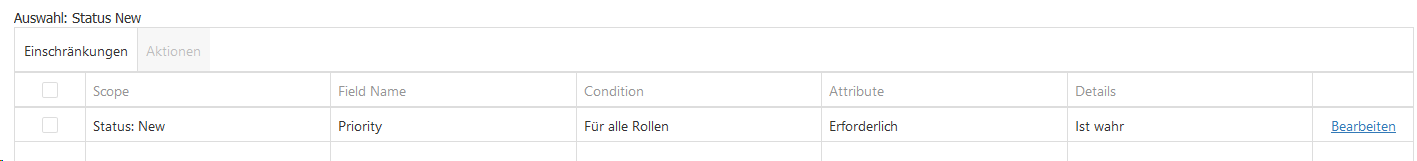 Als nächstes wollen wir die neu erstellte globale Einschränkung für einen bestimmten Zweck konfigurieren. Wir wollen, zum Beispiel, dass das Feld Name verpflichtend ist, wenn man einen Fehler erstellt. Klicken Sie in der Einschränkungstabelle auf Bearbeiten.