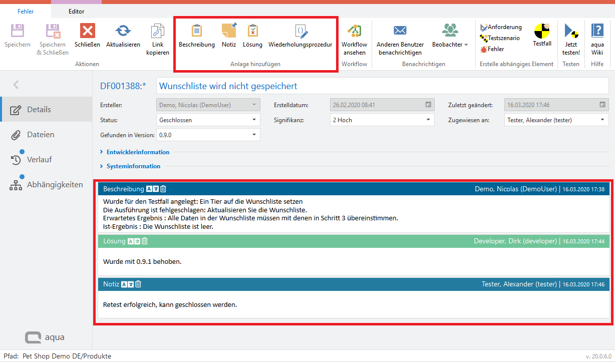 Über die Ribbon Bar eines Fehlers können Sie den Fehler mit Beschreibungsfeldern, Notizfeldern, Lösungsfeldern oder Widerholungsprozeduren ergänzen. Diese werden unterhalb der Beschreibung hinzugefügt und mit einem Zeitstempel sowie dem Bearbeiter gekennzeichnet, um so eine Diskussion zwischen den Mitarbeitern zu ermöglichen.