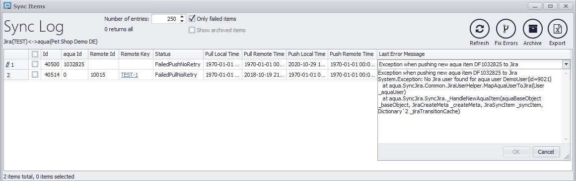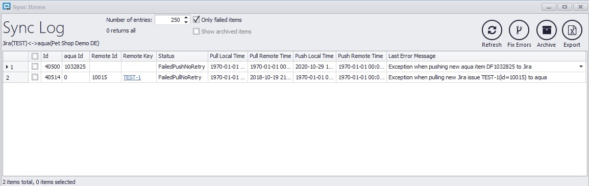 Ein neues Fenster mit einer Liste aller Sync Fehler öffnet sich. Die Checkbox Only failed items ist standardmäßig aktiviert. Daher werden nur Fehler angezeigt. Wenn Sie die Box deaktivieren, wird ein Eintrag für jeden Syncvorgang angezeigt, also auch die erfolgreichen Syncs. Um dies anzuwenden müssen Sie auf Refresh klicken. Der Wert für Number of entries kann angepasst werden. Tragen Sie hier 0 ein, werden alle Sync Errors angezeigt.