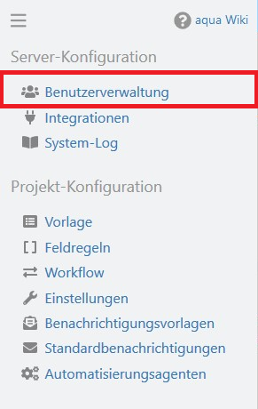 Um Nutzern den Zugriff und die Arbeit mit einem Projekt zu erlauben, müssen Sie diese dem Projekt als Projektmitglieder zuweisen. Starten Sie die Benutzerverwaltung, indem Sie oben links in deraqua Kopfzeile auf das Konfigurationsmenü klicken. Dort wählen Sie im Bereich Server-Konfiguration den Eintrag Benutzerverwaltung aus. Bitte beachten Sie, dass Sie die entsprechenden Rechte benötigen.