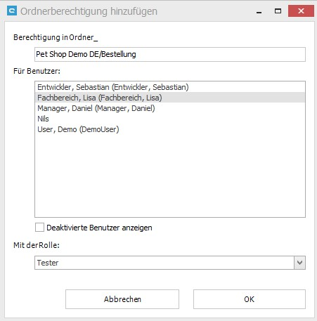 Berechtigungen können für jeden Ordner konfiguriert werden. Zum Beispiel kann ein Benutzer nur Fehler in einem Ordner ansehen, aber in einem anderen darf er Fehler bearbeiten und löschen. Die Ansicht "Berechtigungen im Ordner" erlaubt die Konfiguration dieser speziellen Rechte.