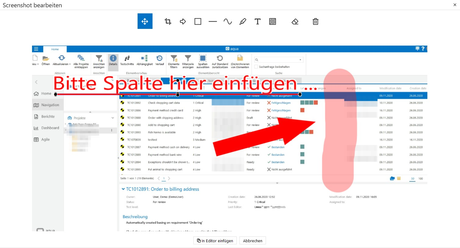 In allen Richtextfeldern, also z.B. Beschreibungsfeldern von Elementen, Testschritten von Testfällen, Diskussionen oder auch tatsächlichen Ergebnissen in Testfallausführungen können Sie über das Bildschirmfoto aufnehmen Symbol im Editor Ihren Bildschirm oder Teile Ihres Bildschirms aufnehmen, bearbeiten und in das Textfeld einfügen.