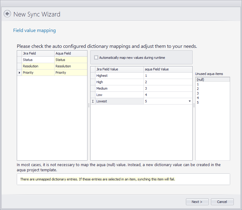Wenn alle Felder so wie gewünscht verknüpft sind, verknüpfen wir die Feldwerte aller Auswahlfelder. Alle Werte in Jira sollten gegen einen Wert in aqua verknüpft. Die werte müssen nicht die gleichen Namen haben.