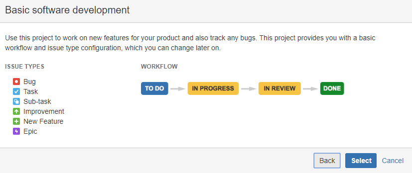 Wir erstellen ein Projekt in Jira, dessen Elemente zum aqua Projek 'Our first Jira Sync' synchronisiert werden. Wir wählen 'Basic software development'.