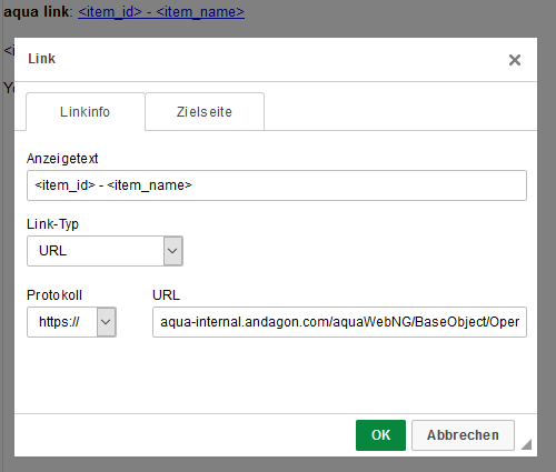 Bitte ersetzen Sie {yourServerOrIP} mit der Adresse Ihres aqua Servers, <item_id> wird zur Laufzeit ersetzt und muss von Ihnen nicht angepasst werden. Eine Beispiel-Konfiguration um einen formatierten Link zu bekommen, zeigt das folgende Bild: