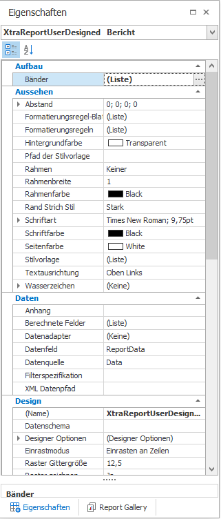 Jedes Element in einem aqua-Bericht hat einen Satz von Eigenschaften, der sein Aussehen und die Aktionen, die ausgeführt werden, wenn ein Element ein Ereignis wirft, bestimmt. Ein Ereignis, das von einem Element geworfen wird kann, zum Beispiel, "Vor Ausdruck", "Nach Ausdruck", "Größe verändert" oder "'Text verändert" sein. Sie können eine Skript-Funktion definieren, die ausgewählt werden soll, wenn solch ein Ereignis geworfen wird. Auf einem "Vor Ausdruck"-Ereignis können Sie, zum Beispiel, den Text des Labels ändern, was nützlich ist, wenn ein Label in einem iterierenden Band gedruckt wird.