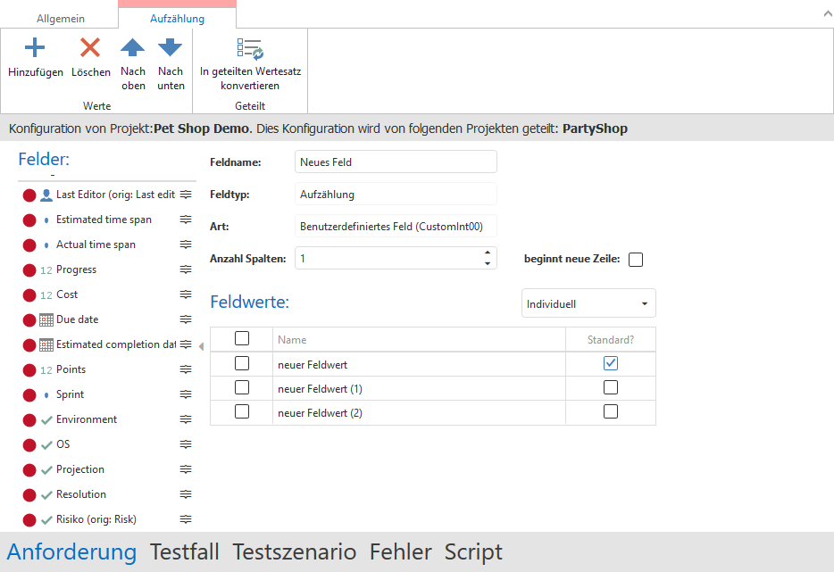 Außerdem können Sie eine existierende, individuelle Wertevorlage in eine geteilte konvertieren. Dazu selektieren Sie ein existierendes Feld vom Typ Aufzählung oder erstellen ein neues.