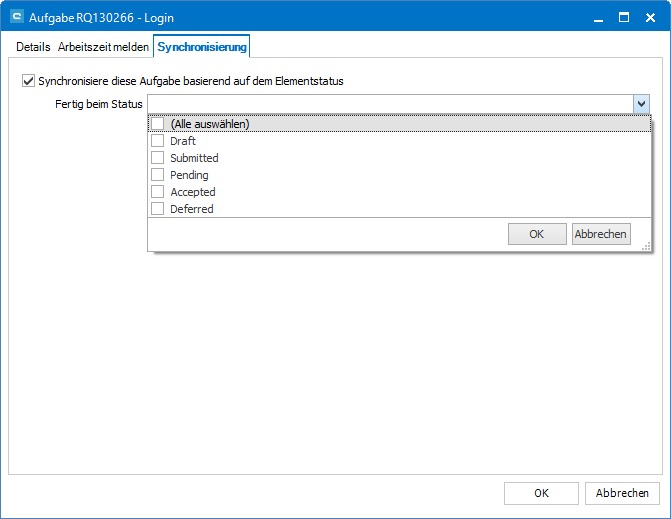 Nun wechseln Sie zum Tab Synchronisierung. Hier können Sie wählen, welcher Status die Fertigstellung des Elements definiert.