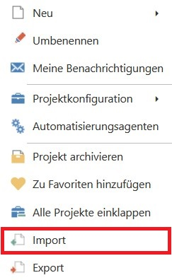 Über das Kontextmenü eines Projektes oder eines Ordners können Sie Elemente aus einer Exceldatei in das ausgewählte Projekt bzw. den ausgewählten Ordner importieren.
