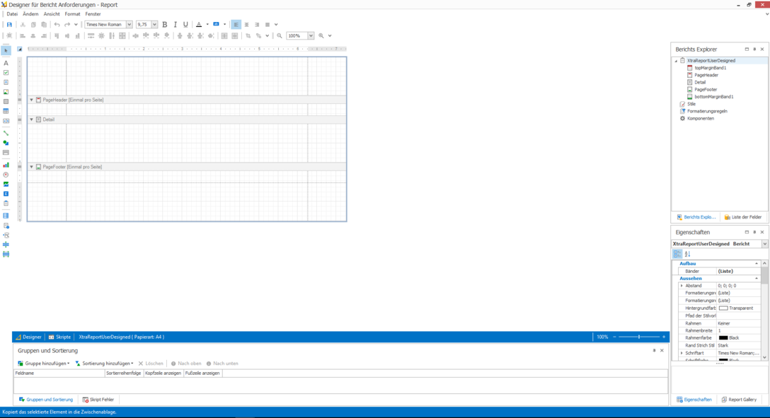 Dort definieren Sie die Bindung in (Datenbindung)->Lesezeichen. Dann definieren Sie dies, indem Sie Data->ReportData->RequirementReport->Requirements->Name benutzen.