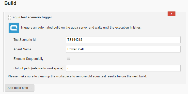 aqua Testszenarien können von Jenkins angesteuert werden. Dies ist ein geeigneter Weg, um Ihre automatisierten Tests in aqua nach einem erfolgreichen Build in Jenkins auszuführen. Um diesen Trigger hinzuzufügen, fügen Sie einen Buildschritt namens aqua Testjob Trigger hinzu. Dieser fügt Ihrem Jenkins Job die folgende Form hinzu: