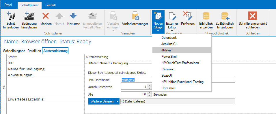 Zuerst öffnen Sie den Testfall und klicken auf Automatisierung. Hier können Sie ein JMeter Skript hinzufügen.