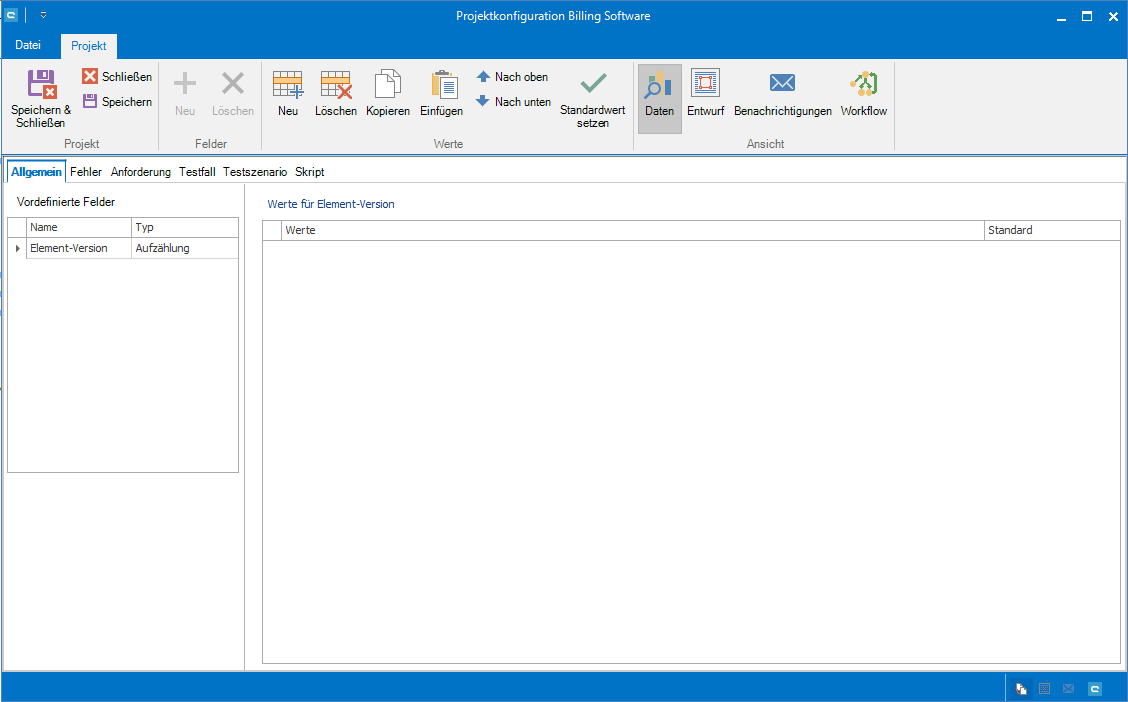 In aqua können Sie einen Workflow für ein bestimmtes Projekt erstellen. Klicken Sie auf den Daten Button im Ansicht-Panel in der Ribbon Bar. Wählen Sie den Fehler-Tab aus. Klicken Sie auf das Status-Feld im Bereich vordefinierte Felder und die Feldwerte für Status werden in der Tabelle rechts angezeigt. Klicken Sie auf den ersten Wert in der Tabelle und dann auf den Löschen Button. Wiederholen Sie dies für alle Werte.