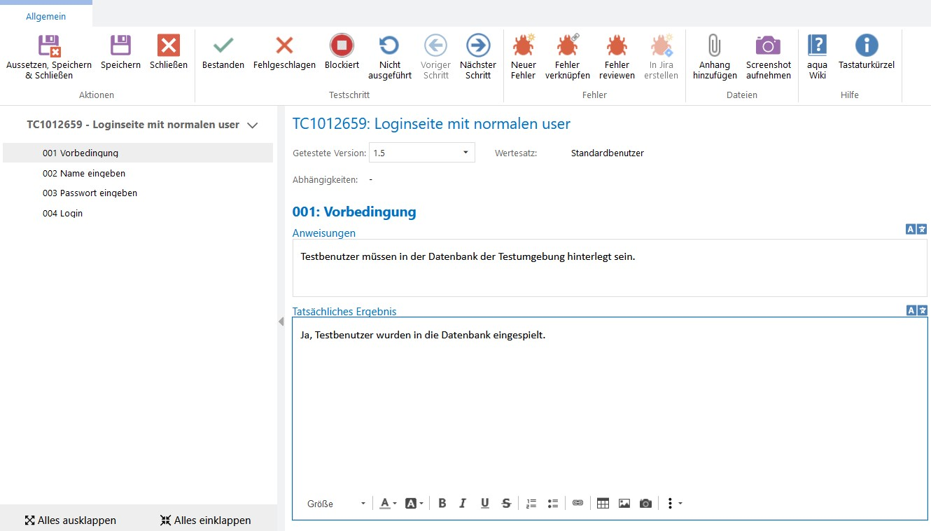 Ein neuer Tab zeigt Schritt für Schritt die Aufgaben an, die im Testfall durchgeführt werden müssen. Der folgende Screenshot zeigt einen Bedingungsschritt. Dokumentieren Sie das aktuelle Verhalten in Tatsächliches Ergebnis. Der Text kann wie in allen Beschreibungsfeldern auch formatiert werden und mit Tabellen oder Bildern erweitert werden (über die Werkzeugleiste in dem unteren Bereich des Ergebnisfeldes oder auch per Copy&Paste).