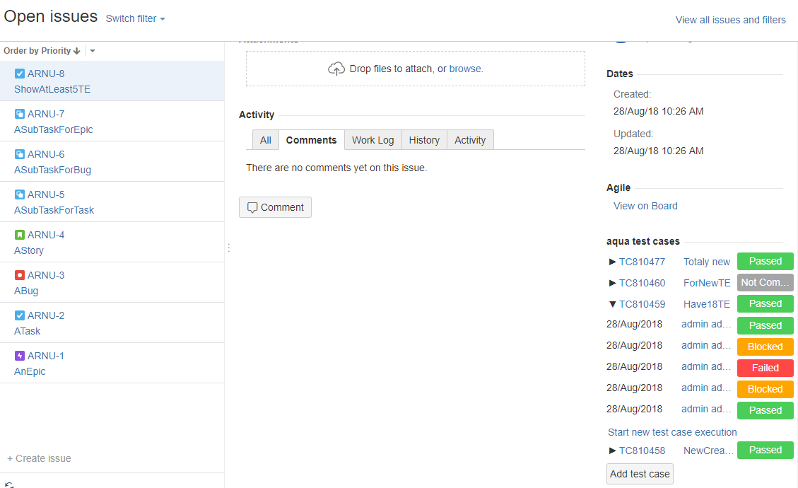 Wenn aqua4Jira korrekt konfiguriert wurde, sehen Sie Testfälle von aqua direkt in Ihrem Jira System.