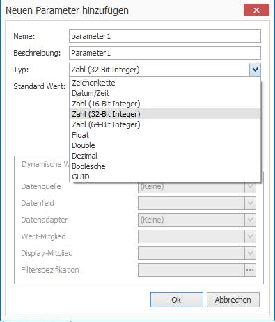 Nachdem Sie einen Rechtsklick auf Parameter gemacht haben, können Sie einen neuen Parameter hinzufügen. Im nächsten Fenster können Sie solch einen Parameter mit den folgenden Werten spezifizieren: