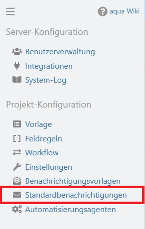 Wählen Sie Ihr Projekt im Projektbrowser aus und klicken oben links in deraqua Kopfzeile auf das Konfigurationsmenü . Dort wählen Sie im Bereich Projektkonfiguration den Eintrag Standardbenachrichtigungen aus.