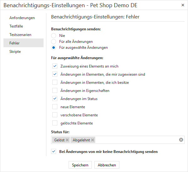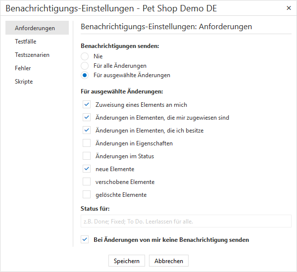 Wenn Sie Änderungen im Status auswählen, können Sie im Feld Status für aus den verfügbaren Status des ausgewählten Elementtyps einen definieren. Die Benutzer erhalten dann nur in diesem spezifischen Status Benachrichtigungen. Sie können auch mehrere Statuswerte selektieren. Wenn Sie das Feld frei lassen, werden für alle Änderungen am Statuswert E-Mails versendet. Außerdem können Sie festlegen, dass bei Änderungen, die von dem jeweiligen Benutzer vorgenommen werden, keine Benachrichtigungen an diesen Benutzer versendet werden.