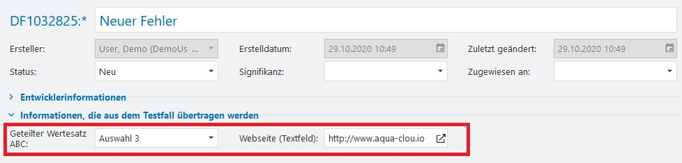 Als Beispiel sehen Sie hier eine Übertragung von einem Auswahlfeld (mit geteiltem Wertesatz) sowie einem Textfeld von einem Testfall in einen Fehler: